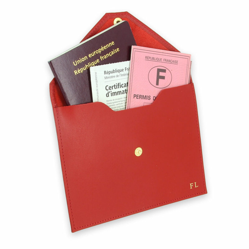 La Pochette documents en cuir est disponible en 4 couleurs : Noir, Rouge, Bleu marine, Beige Gold. Personnalisation possible jusqu’à trois lettres en majuscules.