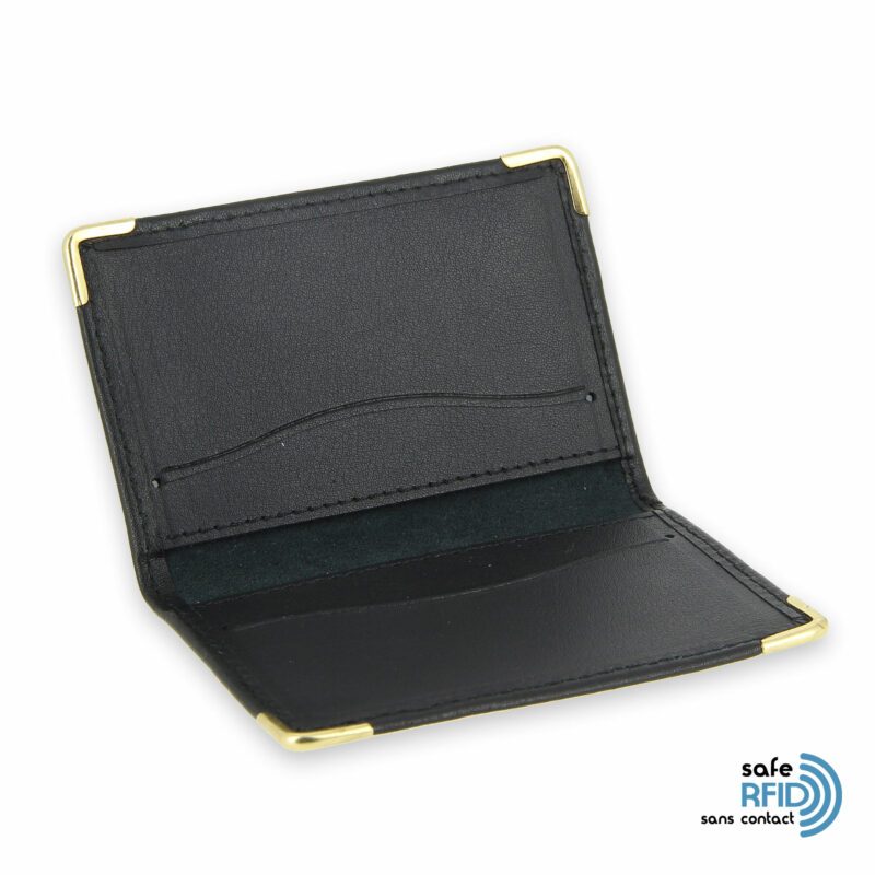 Le Porte carte RFID Protection carte paiement sans contact est simple et robuste. Il permet de ranger des cartes dans ses compartiments. Chaque carte bancaire ou de fidélité est protégée. Les coins dorés donne une touche élégante au porte carte. Grace à sa technologie unique, il protège vos cartes bancaires de paiement sans contact de tout risque de piratage. Disponible en 4 couleurs : Noir, Rouge, Bleu marine, Beige Gold. Personnalisation possible jusqu’à trois lettres en majuscules.